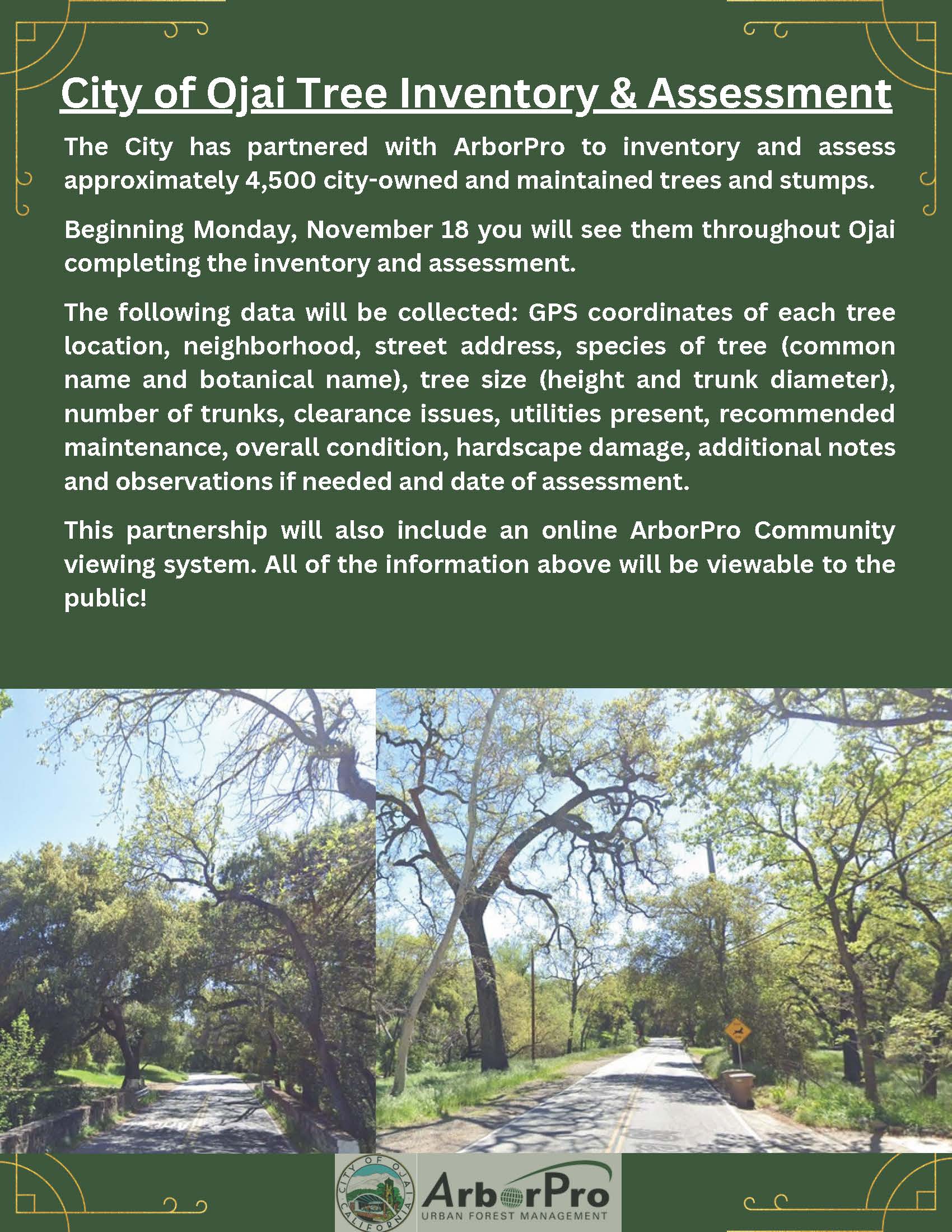 The City of Ojai has contracted with ArborPro, Urban Forest Management to Inventory and Assess city-owned and maintained stumps. They specialize in urban forest management and consulting services and provide a wide range of solutions to help manage urban forests effectively. Services offered include; tree inventory and GIS mapping, urban forest management plans, risk assessment and hazard mitigation, tree health and maintenance services, software solutions, environmental and sustainability consulting, and training and education. For more information on our partnership with ArborPro, please click on the link below.